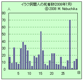 | 7.15 | ディヤラ州で作戦行動中の米軍部隊へのIED攻撃により負傷した米兵1人が搬送先のバグダッドで死亡。(M)(D) モスルで米兵1人死亡,詳細調査中。(D) モスルでイラク治安部隊標的の自爆攻撃2件,警官1人と民間人11人死亡,警官2人と民間人15人負傷。(M) |