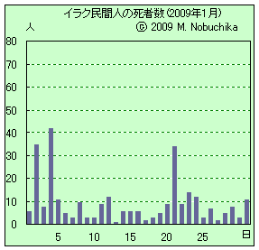 | 1.12 | バグダッド東部で米軍部隊標的のIED攻撃により米兵2人負傷。(AP) バグダッド東部ニューバグダッド地区で駐車中の2台の車が相次いで爆発,警官1人含む3人死亡,10人負傷。(AP)(R) バグダッド西部ヤルムーク地区でイラク軍武器輸送車へのIED攻撃によりイラク兵3人死亡,民間人4人負傷。(AP)(R) バグダッド東部シャアブ地区で警官隊標的のIED攻撃により警官3人含む7人負傷。(AP)(R) バグダッド西部ガザリヤ地区で警官隊標的のIED攻撃により警官3人含む4人負傷。(R) バグダッド中心部カラダ地区で警官隊標的のIED攻撃により民間人1人死亡,警官4人負傷。(AP)(R) モスルでIED攻撃により警官1人死亡。(R) モスルで武装集団の銃撃により警官1人負傷。(R) バグダッド南部ドーラ地区で1人の死体発見。(R) |