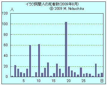 | 8.31 | バグダッド南東ルスタミヤ地区で米軍部隊標的のIED攻撃により民間人5人負傷。(R) バグダッド中心部で政府車列標的のIED攻撃により民間人5人負傷。(R) バビル州マフムディヤの市場で女性の自爆攻撃により2人死亡,12人負傷。(AP) |
