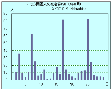 | 8.27 | バグダッド南東部ザファラニヤ地区でIED攻撃により1人死亡,4人負傷。(R) キルクーク西方リヤドで武装集団が民家を襲撃し子ども1人死亡,家族3人負傷。(R) モスル西部で警官隊標的のIED攻撃により民間人1人死亡,1人負傷。(R) モスル南西部でキリスト教徒1人の射殺体発見。(R) モスル西部で迫撃砲弾の着弾により男性1人負傷。(R) キルクーク南西ハウィジャでIED攻撃により民間人2人負傷。(R) |