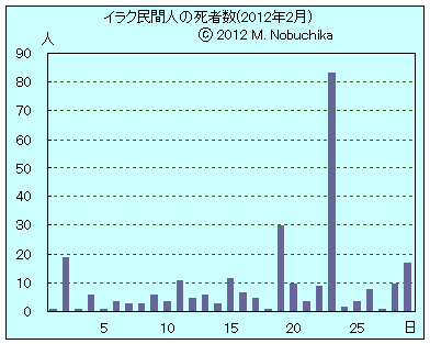 | 2.26 | ディヤラ州ブハリツでIED攻撃により4人死亡。(IB) | [アフガニスタン情勢] 各地でコーラン焼却事件に対する大規模な抗議行動継続,北部クンドゥズ州クンドゥズで数千人規模の抗議行動,近郊の米軍基地で警官に発砲し基地に手榴弾攻撃,米兵7人負傷,米兵と警官の発砲によりデモ参加者2人死亡。(AP) |