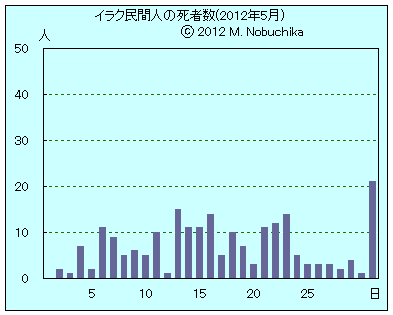 | 5.11 | モスルのニナワ医薬品工場で武装集団の銃撃により警備員1人死亡。(NINA) モスル西方バアジで民間人1人の死体発見。(NINA) アンバル州東部サルサルで7人の射殺体発見。(NINA) |