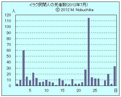 | 7.12 | キルクーク南部で自動車爆弾攻撃により警官1人死亡,1人負傷。(NINA) ワシト州北部の軍検問所近くでのIED攻撃によりイラク軍士官1人死亡,兵士2人負傷。(NINA) モスル東部の警察検問所への武装集団の攻撃により警官1人死亡,民間人2人負傷。(NINA) バグダッド北郊タルミヤでサフワ・メンバーの二輪車に仕掛けられた爆弾によりメンバー1人負傷。(NINA) アンバル州東部で車に仕掛けられた爆弾により民間人2人負傷。(NINA) |