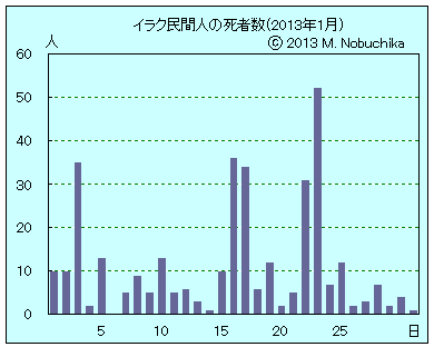 | 1.18 | サーマッラでスンニ派受刑者の解放と無差別的なスンニ派住民の逮捕の停止を要求する3000人規模のマリキ政権批判デモ,アンバル州とニナワ州でも同様のデモ。(AP) キルクークでイラク軍部隊司令部2カ所に計7発のロケット弾が着弾,死傷者なし。(NINA) バビル州北部ジュルフ・アルサカールでIED攻撃により警官3人負傷。(NINA) モスル西部の検問所近くでのIED攻撃により警官2人負傷。(NINA) バビル州北部イスカンダリヤで武装集団の銃撃により警官1人負傷。(NINA) |