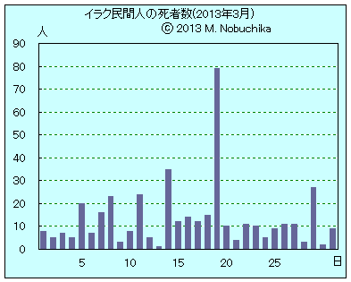 | 3.19 | 米英軍によるイラク攻撃開始から10周年の前日,バグダッド各所,バビル州などシーア派地区での自動車爆弾攻撃や銃撃により少なくとも65人死亡,200人以上負傷,イラク・イスラム国が実行声明。(AP)(NINA) バグダッド地区: [自動車爆弾攻撃] 東部サドルシティで警官含む5人死亡,23人負傷。 南東部ザファラニヤ地区で2件により民間人3人死亡,18人負傷。 南東部ニューバグダッド地区で4人死亡,12人負傷。 北部カジミヤ地区で10人負傷。 東部マシュタル地区で民間人4人死亡,11人負傷。 北部フセイニヤ地区で4人死亡,4人負傷。 北西部シュアラ地区で民間人10人負傷。 北部ウタイフィヤ地区で1人死亡,7人負傷。 南西部シュルタ・ラバ地区で4人死亡,18人負傷。 西部アティバ地区で多数の死傷者,詳細未発表。 [銃撃その他] 西部マンスール地区で車に仕掛けられた爆弾により政府職員1人死亡。 南西部サイディヤ地区で銃撃により民間人1人死亡。 東部サドルシティで車に仕掛けられた爆弾により民間人1人死亡。 西部ガザリヤ地区で銃撃により商店主1人死亡。 中心部グリーンゾーン近くでイラク兵2人含む6人死亡,15人負傷。 バビル州北部イスカンダリヤ,ハスワ,ムサイブの3カ所での警官隊やシーア派住民標的の自動車爆弾攻撃により計10人死亡,28人負傷。 モスル中心街でIED攻撃により民間人3人死亡,警官2人含む5人負傷。 モスル東部で武装集団の銃撃により部族長1人死亡。 モスル西部で車に仕掛けられた爆弾により警官1人死亡,2人負傷。 モスル北部でIED攻撃により州情報機関員1人死亡。 ティクリート東部で2件のIED攻撃により警官2人死亡,1人負傷。 サラハディン州トゥズクルマトで食料品店への武装集団の銃撃とIED攻撃により民間人2人死亡,4人負傷。 バイジ中心部で自動車爆弾攻撃により警官1人死亡,民間人11人負傷。 |
