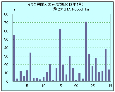 | 4.30 | バグダッド南部ドーラ地区のスンニ派モスク近くでのIED攻撃により礼拝者4人死亡,20人負傷。(AP) バグダッド南部シュルタ地区でIED攻撃により2人死亡,3人負傷。(NINA) バグダッド西部マンスール地区でIED攻撃により民間人1人死亡,4人負傷。(NINA) サラハディン州スレイマンベグの検問所への自動車爆弾による自爆攻撃により警官含む2人死亡,5人負傷。(NINA) バクバ北東部でIED攻撃により民間人1人死亡,9人負傷。(NINA) バグダッド北郊タージで武装集団の銃撃により団体職員1人死亡。(NINA) |