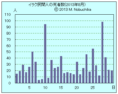 | 8.23 | バグダッド北部カヒラ地区の公園での自爆攻撃により28人死亡,55人負傷。(AP)(NINA) バグダッド北部アザミヤ地区で武装集団の銃撃により4人死亡。(AP) バグダッド西部ジハド地区とアダミヤ地区のスンニ派モスク近くでのIED攻撃により礼拝者計3人死亡,18人負傷。(AP)(NINA) バグダッド南部アラブ・ジョブール地区でIED攻撃により民間人1人死亡,4人負傷。(NINA) バグダッド西部シュルタ地下道で武装集団の銃撃により不動産業者1人死亡,息子1人死亡。(NINA) ティクリート南方ドゥジェイルで武装集団が婦人服店主宅を襲撃し店主と家族計3人死亡,1人負傷。(AP)(NINA) ファルージャ東方ハスワ地域でIED攻撃により民間人1人死亡,1人負傷。(NINA) アンバル州西部カイムでシリア側から侵入しようとしたイラク・イスラム国財務相を治安部隊が逮捕。(NINA) |
