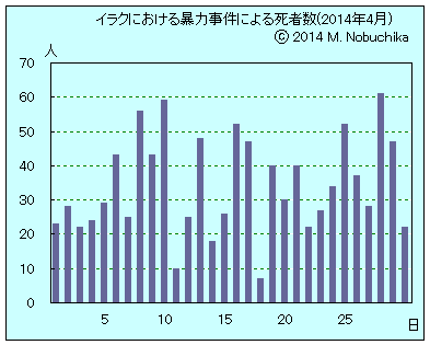 | 4.26 | ファルージャで治安部隊の作戦行動によりISIL武装勢力指揮官含む5人死亡。(NINA) ファルージャ北東のイラク軍検問所へのISIL武装勢力の攻撃によりイラク兵2人死亡,2人負傷,応戦により武装勢力6人死亡。(NINA) アンバル州西部カイムの投票所を武装勢力が爆破。(NINA) ラマディ北部の警官宅を自爆攻撃した武装勢力への応戦により自爆攻撃未遂者2人含む武装勢力6人死亡。(NINA) ラマディ北部と東部で武装勢力とイラク軍との激しい戦闘,詳細未発表。(NINA) バグダッド西部アミル地区のスンニ派居住地区で武装集団の銃撃により民間人2人死亡,4人負傷。(AP)(NINA) バグダッド東郊シーア派居住のナシール地区の食堂内での爆弾攻撃により4人死亡,11人負傷。(AP)(NINA) バグダッド南西部サイディヤ地区で警官隊標的のIED攻撃により警官1人死亡,警官2人と民間人3人負傷。(NINA) バグダッド各所で計9人の射殺体発見。(AP) バクバ北東部でIED攻撃により民間人1人死亡,2人負傷。(NINA) バクバ南部と西部でIED攻撃により警官2人と民間人2人負傷。(NINA) ティクリート北部でIED攻撃によりイラク兵2人死亡,3人負傷。(NINA) ティリート南方で武装集団の襲撃によりサラハディン州議会議員1人と護衛官2人死亡,息子1人負傷。(NINA) ティクリート東部ドール地区でIED攻撃により警官1人含む4人死亡,1人負傷。(NINA) バイジ地域の7カ所の投票所への武装勢力の爆弾攻撃により警官3人死亡,2人負傷。(NINA) モスル西部でイラク軍の作戦行動によりISIL武装勢力10人死亡。(NINA) モスル東部でイラク軍がマリキ首相発行の逮捕状により「法治国家連合」事務所長を逮捕。(NINA) モスル南部でIED攻撃により反ISIL部族長1人死亡。(NINA) キルクークの投票所への武装集団の銃撃によりイラク兵2人と民間人1人負傷。(NINA) |