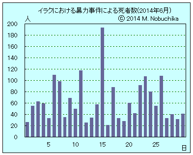 | 6.29 | ラマダン初日,ISIL報道官が同組織のバグダディ指導者をカリフ(ムハンマドの後継者)としシリア・イラクの支配下地域にカリフ統治領としてのイスラム国の樹立を宣言。(AFP)(AP) ティクリートをイラク軍ヘリが空爆,北郊カディシヤで激しい戦闘,ISILが依然としてティクリートを掌握,住民情報。(AP) 各地での過去24時間の治安部隊の102の軍事作戦行動により武装勢力142人死亡,イラク軍参謀本部報道官発表。(NINA) ラマディ東郊ハバニヤで武装勢力の攻撃により地区警察本部長1人と護衛官3人死亡。(NINA) キルクーク南方のバシール村でISIL武装勢力と志願兵部隊との交戦により志願兵1人死亡,7人負傷,ISILの砲撃によりペシュメルガ隊員8人負傷。(NINA) バグダッド南郊マダインで武装集団の銃撃により警官1人死亡。(NINA) バグダッド南東部ディヤラ橋地域で車に仕掛けられた爆弾により民間人1人死亡,1人負傷。(NINA) バグダッド西部ガザリヤ地区でIED攻撃により民間人1人死亡,7人負傷。(NINA) バクバ北方クハリスの検問所への武装集団の攻撃により警官2人と民間人1人負傷。(NINA) |