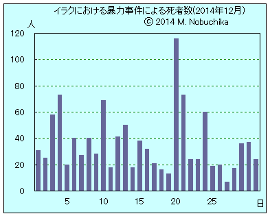 | 12.12 | カルバラでロケット弾攻撃によりアルバニア人巡礼者1人死亡,2人負傷。(NINA)(R) バクバ北東ミクダディヤで自爆攻撃と迫撃砲攻撃により少なくとも5人死亡,8人負傷。(R)(NINA) バクバで武装集団の攻撃により警官1人死亡,1人負傷。(NINA) モスルでISが警官2人を処刑。(NINA) バイジ東部でISが部族民12人を殺害。(IN)(IB) ラマディでISと治安部隊との戦闘により警官3人と民間人15人死亡。(IB) ティクリート南方地域でIED攻撃により民衆動員兵9人死亡。(NINA) ファルージャ南郊アミリヤ・ファルージャでISの迫撃砲攻撃により民間人9人負傷。(NINA) サーマッラでIS軍がイラク軍ヘリを撃墜し乗員2人死亡。(AP) モスル西部バアジで有志連合国軍の空爆によりISメンバー5人死亡。(NINA) バクバ北東地域でイラク軍ヘリの空爆によりISメンバー2人死亡。(NINA) アンバル州中部ヒートからラマディ間で空爆によりISメンバー7人死亡。(NINA) アンバル州西部ラワのISの拠点を有志連合国軍が空爆。(NINA) ラマディ中心部で自動車爆弾の設定中の爆発によりISメンバー6人死亡。(NINA)(IN) サーマッラ南方ムタシムでイラク軍の空爆を含む作戦行動によりISメンバー25人死亡。(NINA) サーマッラでイラク軍の空爆を含む作戦行動によりISメンバー15人死亡。(IN) ラマディ東部で治安部隊の作戦行動によりISメンバー35人死亡。(IN) ティクリート南部地域の村で治安部隊の作戦行動によりISメンバー17人死亡,同村をISの支配から解放。(IN) ラマディ西部地域から治安部隊が弾薬不足のために撤退しISが同地域を再び支配。(NINA) |