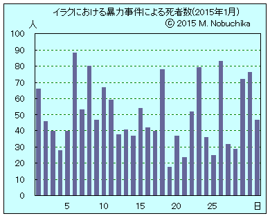 | 1.1 | 保健省・内務省・国防省の合同統計で2014年の暴力行為による死者は市民と治安部隊員の合計で15,538人と発表。(AFP) ファルージャでISが忠誠を誓わなかったジャミラ部族民15人を斬首などにより処刑。(NINA)(IN) ティクリート東部ドール地区近くのディジラ川で民間人23人の射殺体発見。(NINA) バラドのヤスリブ地域で家屋に仕掛けられた爆弾攻撃により民衆動員兵7人死亡。(NINA) バクバ北東ミクダディヤで武装集団の銃撃により民間人2人死亡。(NINA) ティクリート東方トゥズクルマトでISに誘拐され処刑されたトルクメン人3人の死体発見。(NINA) バスラ西方ズバイルで武装集団の銃撃によりモスル聖職者4人死亡,警備の警官1人負傷。(NINA)(AP) モスル南東地域の4つの村をイラク軍とペシュメルガがISの支配から解放。(IN) バクバ北東地域で迫撃砲攻撃によりIS戦闘員5人死亡。(NINA) キルクーク西方ハウィジャ西部ザブ地域でISが市議会議員9人を逮捕しモスル南方カイヤラへ連行。(NINA) |