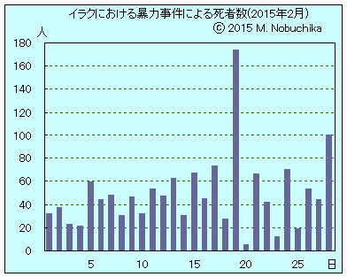 ISが後藤健二氏の殺害を告げる画像と声明をウェブ上に公表したことを受けて開かれた関係閣僚会議で,安倍首相が「非道,卑劣極まりないテロ行為に強い怒りを覚える。許しがたい暴挙を断固非難する。テロリストたちを絶対に許さない。その罪を償わせるために国際社会と連携していく。日本がテロに屈することは決してない。中東への食糧、医療などの人道支援をさらに拡大していく」と述べる。(2)(3) | 国連イラク派遣団(UNAMI)が1月の暴力事件によるイラク人死者は民間人790人,治安部隊員585人の計1,375人,負傷者は民間人1,469人,治安部隊員771人と発表,アンバル州と北部地域での戦闘関連の死傷者は含まず。(AP)(R) | |||