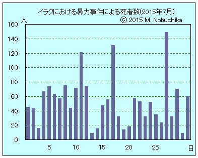 | 7.21 | バグダッド東部ニューバグダッド地区(シーア派地区)で自動車爆弾攻撃により16人死亡,48人負傷。(AP)(R) バグダッド南東部ザファラニヤ地区でIED攻撃により2人死亡,9人負傷。(R)(NINA) バグダッド北郊タルミヤの検問所への自爆攻撃により治安部隊員6人死亡,8人負傷。(R)(IN) バクバ地域マンダリで自動車爆弾攻撃により8人死亡,16人負傷。(R)(NINA) バクバ北西クハリスで砲撃により民間人8人死亡,20人負傷。(IN) ファルージャで迫撃砲攻撃により女性と子ども含む民間人9人死亡,12人負傷。(IN) ファルージャ東郊カルマの治安部隊司令部へのISの攻撃によりイラク兵2人死亡,4人負傷,有志連合国軍の空爆によりIS戦闘員18人死亡。(IN) サーマッラ南方ドゥルイヤで迫撃砲攻撃によりイラク軍将校1人死亡,兵士2人負傷。(IN) ティクリート東部地域で武装集団の銃撃により民衆防衛隊員2人死亡。(NINA) ラマディ東郊ハシバ地域で警官隊の作戦行動によりISメンバー11人死亡。(IN) タルアファルとモスル東部カラマ地区でISの内紛により戦闘員計33人死亡。(IN) モスル西部地域で有志連合国軍の空爆によりISメンバー22人死亡。(NINA) ファルージャ北方地域でISの攻撃をイラク軍の空爆支援下で民衆防衛隊が撃退しIS戦闘員40人死亡。(NINA) モスル西方バアジで有志連合国軍の空爆によりISメンバー15人死亡,5人負傷。(NINA) モスル西部バドゥシュ地区で有志連合国軍の空爆によりISメンバー12人死亡,3人負傷。(NINA) タルアファルで有志連合国軍の空爆によりISメンバー18人死亡。(NINA) ラマディ東郊フサイバで警官隊の作戦行動によりIS戦闘員57人死亡。(NINA) |