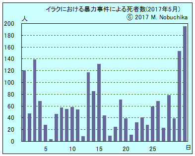 | 5.11 | モスル西部地域の約90%を政府軍がISの支配から奪還し制圧したと軍当局発表。(IN) モスル北部地域から政府軍が旧市街へ向けて進軍。(AP) #モスルで政府軍の空爆と砲撃により民間人49人死亡。(IB) バグダッド東部ショラ地区(シーア派地区)で自動車爆弾攻撃により4人死亡,10人負傷。(IN)(NINA) キルクーク北方ラヒーム・アワ地区で武装集団の銃撃により警官1人死亡。(IN) ラマディ南西ラザザ湖地域に侵入したIS戦闘員の自爆攻撃をイラク軍部隊が阻止し攻撃者2人死亡。(IN)(NINA) タルアファルで政府軍がISの攻撃を撃退しIS戦闘員4人死亡,14人負傷。(NINA) |