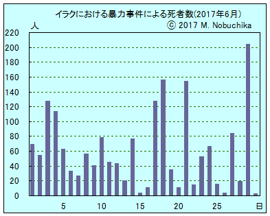 | 6.30 | タルアファルでISの最高幹部の1人アブ・バラア・マウセリ説教師が金曜礼拝でモスルでのISの敗北を認めタルアファルをカリフ国家の臨時司令部とする声明を発表,同市でアブ・クタイバ上級幹部が演説中にバグダディ最高指導者の死亡を示唆。(IN) モスル西部旧市街に残存するIS支配地域のほとんどを政府軍が奪還。(IN) モスル西部ヤルムーク地区で治安部隊がISの自爆攻撃を阻止しIS戦闘員3人死亡。(NINA) バビル州中部ヒッラ北部で2人の死体発見。(NINA) |