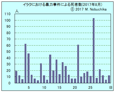 | 8.28 | バグダッド東部サドルシティのジャミラ市場で自動車爆弾攻撃により少なくとも12人死亡,28人負傷,ISが実行声明。(AP)(R)(IN) バグダッド北郊タルミヤでIED攻撃により民間人2人負傷。(IN) ISから解放された地域に住民210万人以上が帰還したと政府が発表。(IN) タルアファル北西地域でペシュメルガが避難住民に紛れ込んでいたISメンバー200人を逮捕。(IN) タルアファル北西地域でペシュメルガがISの攻撃を撃退しIS戦闘員4人死亡,12人逮捕。(IN) ディヤラ州北東部でイラク軍の空爆によりIS戦闘員5人死亡。(IN)(NINA) モスル北西バドゥシュ地区で治安部隊の作戦行動により同地区に侵入しようとしたISメンバー20人死亡。(NINA) |