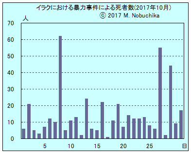 | 10.11 | アンバル州中部ヒートの喫茶店で治安部隊員標的の自爆攻撃により民間人11人死亡,15人負傷。(AP)(IN) キルクーク東部地域で武装集団の銃撃により1人死亡,1人負傷。(NINA) 高等司法評議会がクルド自治区の独立の是非を問う住民投票を実施した投票管理委員会幹部の逮捕状を発行。(IN) アンバル州西部カイムとラワ地区のIS支配地域解放作戦のためにイラク軍・内務省対テロ部隊・連邦警察が進軍を開始。(IN) アンバル州西部カイムでイラク軍の空爆によりIS戦闘員14人死亡。(IN)(NINA) キルクーク西方ハウィジャで警官隊が住民の協力下でのIS掃討作戦によりISメンバー3人死亡。(NINA) |