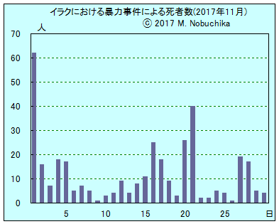 | 11.18 | モスル東部ワダ地区で武装集団の銃撃により民間人1人死亡,1人負傷。(NINA) モスル東部コカグリ地区で女性1人の射殺体発見。(NINA) バグダッド南方地域の部族民兵部隊検問所への武装集団の銃撃により民兵1人死亡,2人負傷。(IN) バグダッド西方地域で車に仕掛けられた爆弾により治安部隊員1人死亡。(IN) バグダッド南東郊ジスル・ディヤラ地域で武装集団の手榴弾攻撃により民間人2人負傷。(IN) アンバル州西部地域でのIS掃討作戦によりISメンバー16人死亡。(IN) |