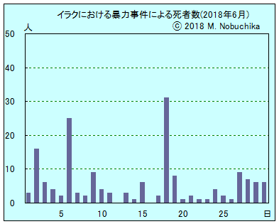 | 6.18 | アンバル州北西部シリア国境地域のイラン支援のシーア派民兵部隊の司令部への米軍の空爆により民兵22人死亡,12人負傷。(R)(IN) モスル南部地域でISが検問所を設置し労働者4人とシーア派民兵2人を誘拐し処刑。(IN) アンバル州西部シリア国境地域でイラク軍の空爆によりISメンバー多数死傷。(IN) アンバル州西部カイム地域で国境警備隊員がISのシリアからの侵入を阻止しISメンバー2人死亡。(IN) |