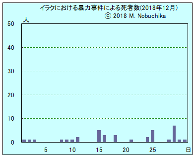 | 12.15 | ラマディでIED攻撃により道路警備中の警官3人死亡。(IN) ラマディでIED攻撃により警官1人死亡。(IN) 南部ディワニヤで部族間紛争により民間人1人死亡。(IN) バスラでの公共サービスの改善を求める抗議行動中に参加者の発砲により州議会メンバー1人負傷。(NINA) |