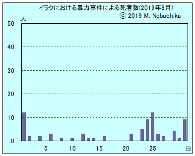 | 8.31 | バスラ州ズバイル地区で部族間対立による銃撃戦で1人死亡,3人負傷。(IN) ディヤラ州各地でイラク軍の作戦行動によりISの隠れ家3カ所を破壊。(NINA) バクバ北東ジャラウラ地域でイラク軍がIS残存勢力掃討作戦を開始。(NINA) バクバ北東カナキン郊外の村をISが襲撃し住民とイラク兵計3人負傷。(NINA) |