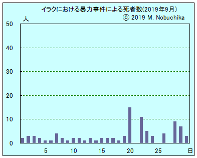 | 9.20 | カルバラ北部入り口でバスに仕掛けられたIED攻撃により12人死亡,5人負傷,ISが実行声明。(R)(NINA) クート南方ドゥジャイリ地域で武装集団の銃撃により2人死亡,1人負傷。(NINA) モスル西部ヤルモウク地域で武装集団の襲撃により村長1人死亡。(NINA) バクバ北東ジャラウラ郊外でIED攻撃により農夫2人負傷。(NINA) キルクーク西方ハウィジャ地域の村をISが発射した迫撃砲弾4発が着弾,資料者等の情報未発表。(NINA) モスルで治安部隊がISの女性メンバー2人を逮捕。(NINA) |