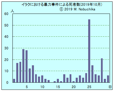 | 10.31 | バグダッドで反政府デモに対する治安部隊の鎮圧行動によりデモ参加者1人死亡,50人以上負傷。(R) バグダッド北郊タルミヤでISの攻撃によりイラク兵1人死亡,5人負傷。(NINA) バクバ西方カトゥン地域でパトロール中の治安部隊標的のIED攻撃,死傷者なし。(NINA) |