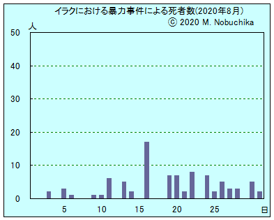 | 8.26 | ニナワ州北西部シンジャル地域でトルコ軍の空爆により民間人2人死亡。(NINA) バクバ北東カナキン近くの村をISが襲撃し民間人1人死亡,2人誘拐。(NINA) バクバ北方アジム地区でIED攻撃により民間人3人負傷。(NINA) モスル南方地域の村でIED攻撃により民間人2人負傷。(NINA) モスル東部バルテラ地区で国際食糧機関の車へのIED攻撃により職員1人負傷。(NINA) モスルとアルビルを結ぶ道路で国連支援団の車列標的のIED攻撃により職員2人負傷。(NINA) |