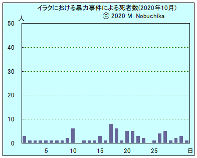 | 10.20 | モスル南東90qのマクムール地区でIED攻撃により民間人4人死亡,1人負傷。(NINA) アマラで部族間抗争により1人死亡。(NINA) キルクーク地域の村で警察がISに処刑された50人以上の死体発見。(NINA) |