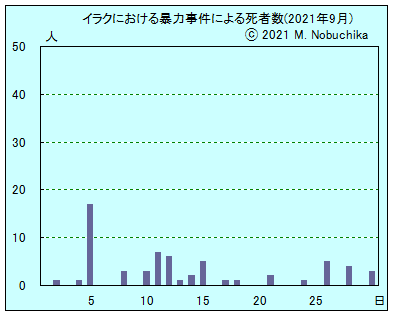 | 9.16 | モスル南方カイヤラ地区でISの設置したIED攻撃により民間人2人負傷。(NINA) バクバ北東ミクダディヤ西部に迫撃砲弾3発が着弾,死傷者なし。(NINA) 北部地域でトルコ軍の空爆によりクルド労働者党(PKK)戦闘員2人死亡,トルコ国防省発表。(NINA) |